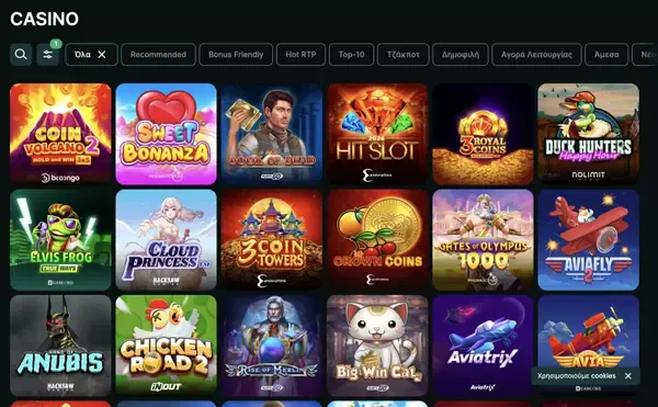 Κρατάμε το interface καθαρό, με ξεκάθαρες ετικέτες κατηγοριών και απλά φίλτρα. Η δομή του μενού είναι φτιαγμένη ώστε να φτάνεις σε φρουτάκια, live dealer και προσφορές με λίγα κλικ. Η αναζήτηση είναι σχεδιασμένη για να βρίσκει παιχνίδια με βάση το όνομα και τον πάροχο και τα πλακίδια παιχνιδιών δείχνουν βασικές λεπτομέρειες πριν ανοίξεις έναν τίτλο.